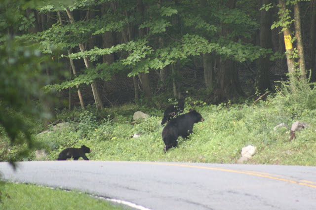 As I was watching them, I suddenly heard a faint but crisp sound of a twig snapping. I glanced over my shoulder behind me and to my amazement, there was another mother with another set of cubs in tow! My attention turned toward them now and I watched Momma glide on by, her black coat shimmering; her cubs pouncing behind her in the woods. It's not often (like, never) to see two families of bears at once! I was surprised and excited. They were making their way through the woods and toward the road. I thought I was undetected, but I watched the mother stop and warn her cubs to be still and silent, and they indeed froze. She then, without hesitation, stepped out onto the road and for the first time (or so I thought) looked directly at me. She checked me out, cocking her head from side to side, seemingly trying to figure me out--it's probably not too often (like, never) that she ever saw a tripod erected!